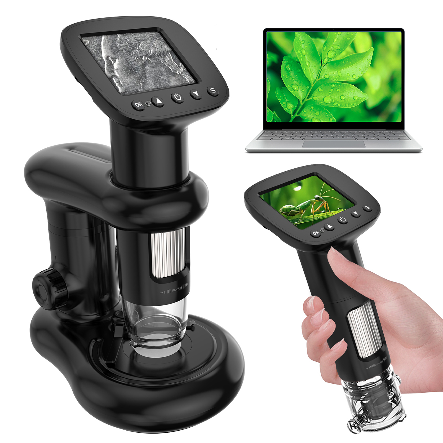 This microscope can display images directly through the built-in screen, or can be connected to a PC to show images in the camera software. (Cannot display simultaneously.)
