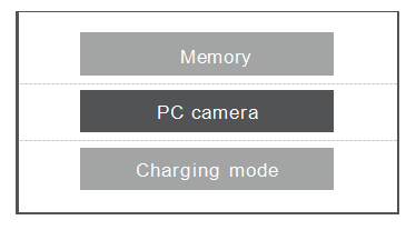 When the device is on and connected to the PC via a USB cable, there are 3 modes of Memory / PC camera / Charging mode available to the user.