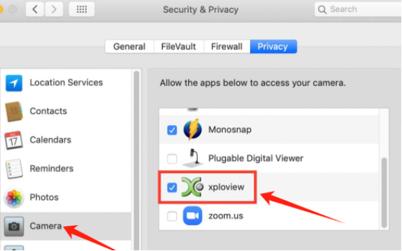 Please allow the xploview software to access your camera. Run “Security&Privacy” - Privacy” - “Camera”