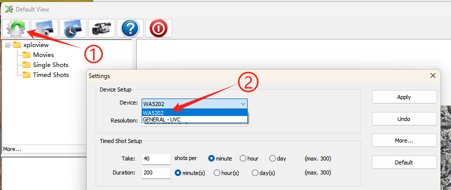 Run the "xploview" app and click “Settings” – “Device” to select “WA5202” on the dropdown list, finally click "Apply".